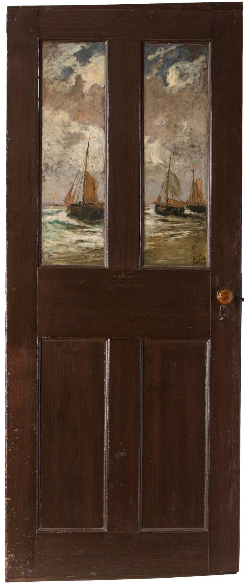 Howe transformed the flat panels of the door into a window that takes one out to open sea where boats are following one another in a kind of formation. Their sails are in various states, but the three vessels all seem intent on the same destination. With so much foam on the water and heavy dark clouds overhead, they could be heading to shore to escape a coming storm – note how the wind tears at the orange flags atop each mast. A tonalist painter, Howe has employed a limited palette of grays and browns, sharpened with patches of white from bottom to top, to create a scene with a dramatic flair. Tonalist landscapes usually have an air of melancholy or they inspire meditation, but this tonalist seascape, with its turbulent big sky and a sense of movement, has a more invigorating effect.