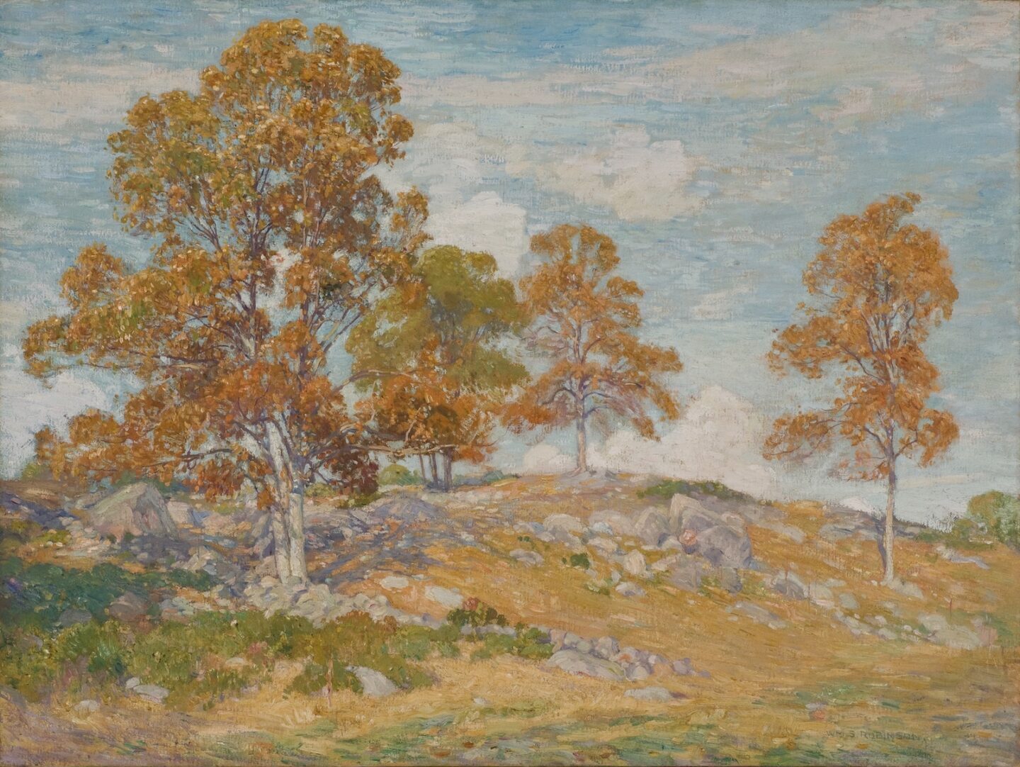 “His best pictures are not always of sailing vessels but more often of Connecticut hillsides and pasture lands, especially about Old Lyme where he lived for thirty-one years in the old Griswold House, working in a studio across the brook from the Lyme Art Association Gallery.” — Robinson’s biographer for the Salmagundi Club, Frederick Lester Sexton, 1945
