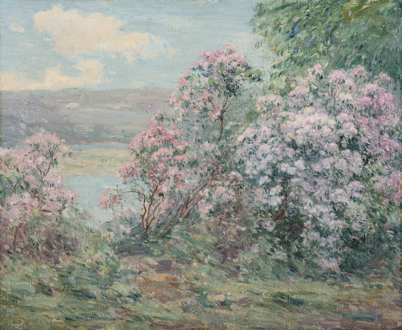 Around 1890, he traveled to Paris to study at the Académie Julian. Upon his return to the United States, he began to exhibit his art and teach in both Philadelphia and New York. In 1905, Robinson traveled from New York to Old Lyme to stay at the boardinghouse of Florence Griswold. He worked in a studio near the brook that flows in the corner of the property. In 1921, Robinson moved into the boardinghouse and established a full-time studio on the grounds. During this same year, the new building for the Lyme Art Association, designed by Charles Platt, opened, and Robinson became a charter member—years later he was elected their president. Once sequestered in Old Lyme, his paintings revel in the surrounding landscape.