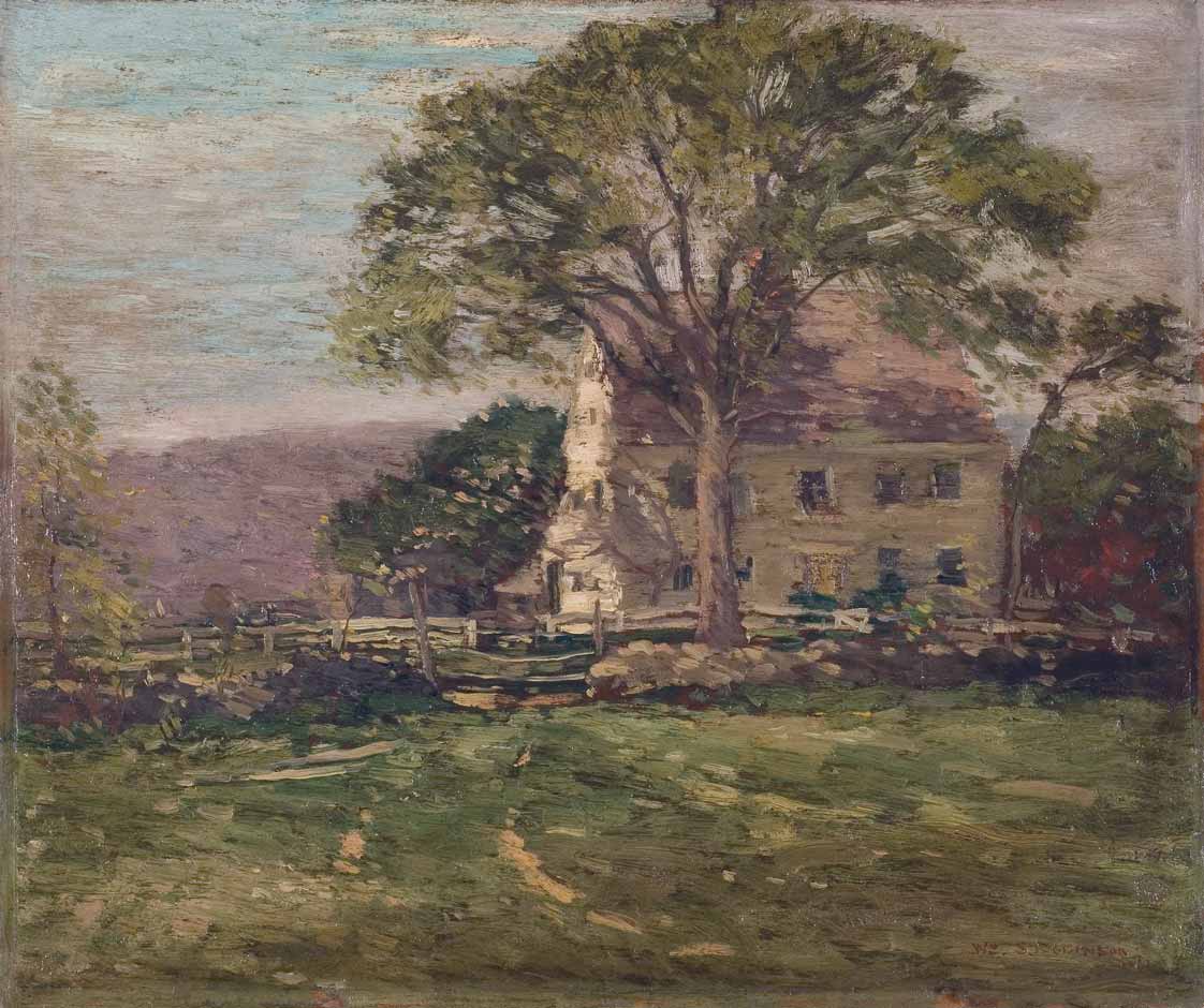 Although he included a cottage or two in paintings he had done earlier in Giverny, France, William Robinson’s decision to portray an old house for his dining room panel is surprising, for he was essentially a pure landscape and marine painter. Like many of the Old Lyme colonists, Robinson was a well-known and well respected artist when he arrived. He had won honors at national and international exhibitions and would soon garner more. In Old Lyme he found subject matter that interested him for the rest of his life.