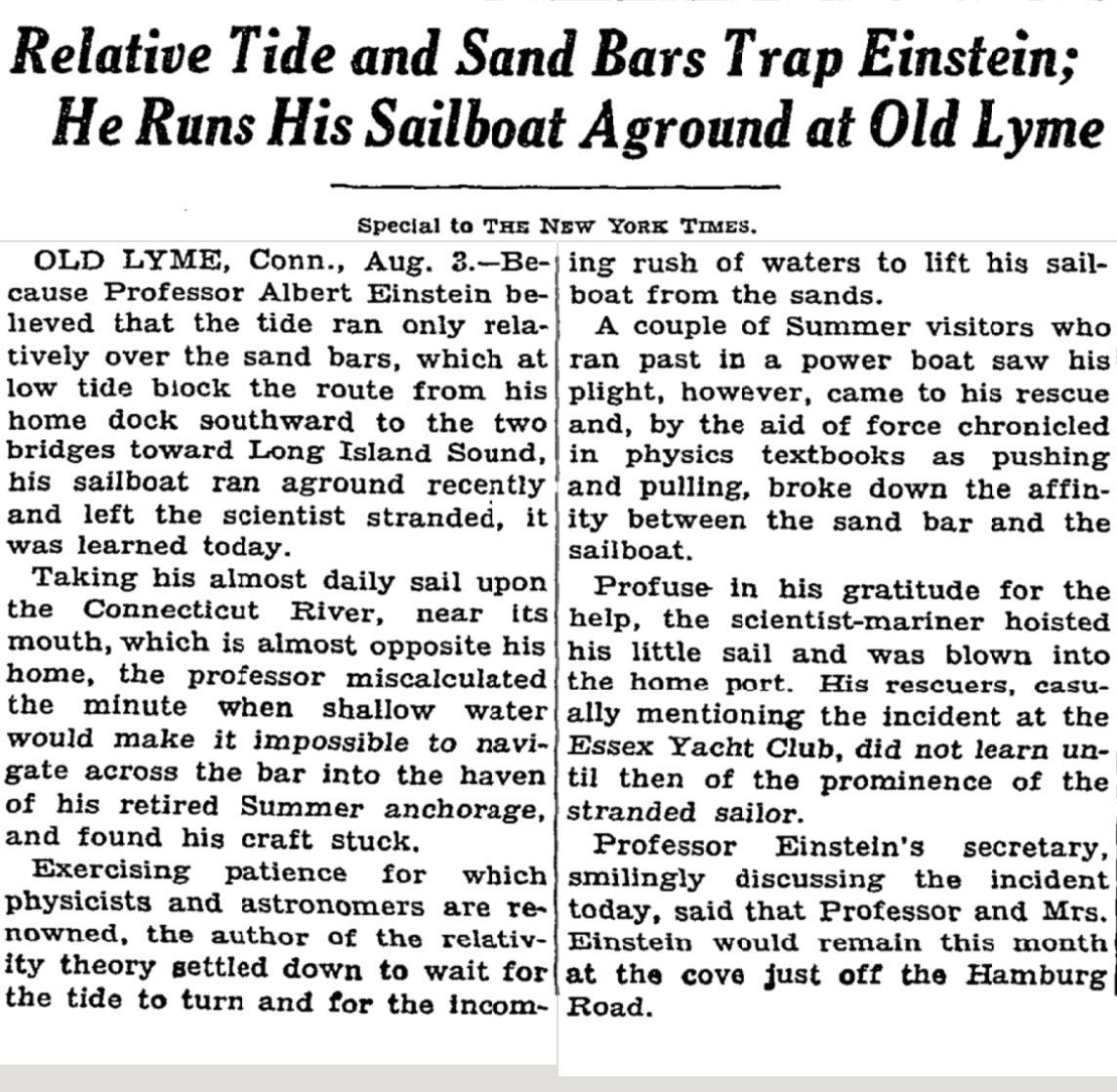 The New York Times reported Einstein’s sailing mishap in Old Lyme. The New York Times, August 4, 1935, page 1.