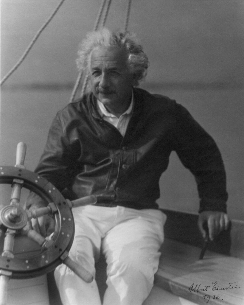 Einstein poses for a photograph while sailing, 1936. Image courtesy of the AIP Emilio Segrè Visual Archives, gift of Edgar Edelsack