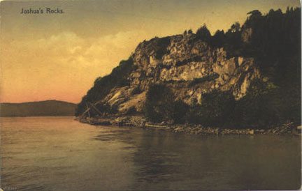 Brockway’s autobiography Fifty Years of Prison Service notes that the cliffs were “always in the sight and mind of the children living near” and describes “King Joshua” as an aboriginal Indian chief who “was wont to seat himself and survey and rule his tribe” from the cleft in the rocks. A Selden family genealogy includes a more threatening version of the legend, claiming that the “royal Indian,” from his seat at the top of the perpendicular cliff, would “fire his arrows upon the white men as they sailed up the Connecticut River.” A genealogy of the Harvey family describes the Joshuatown section of Lyme as “at one time the favorite haunt of Attawanhood (1630–1676), or Joshua,” and states that he discharged arrows from his cliff-top seat “at persons passing up and down the river in boats or canoes and compelled them to land and pay him tribute.” Today sightseers on a river cruise to observe bald eagles are told that a Mohegan sachem would look down and watch his tribe members fishing below.[1]
