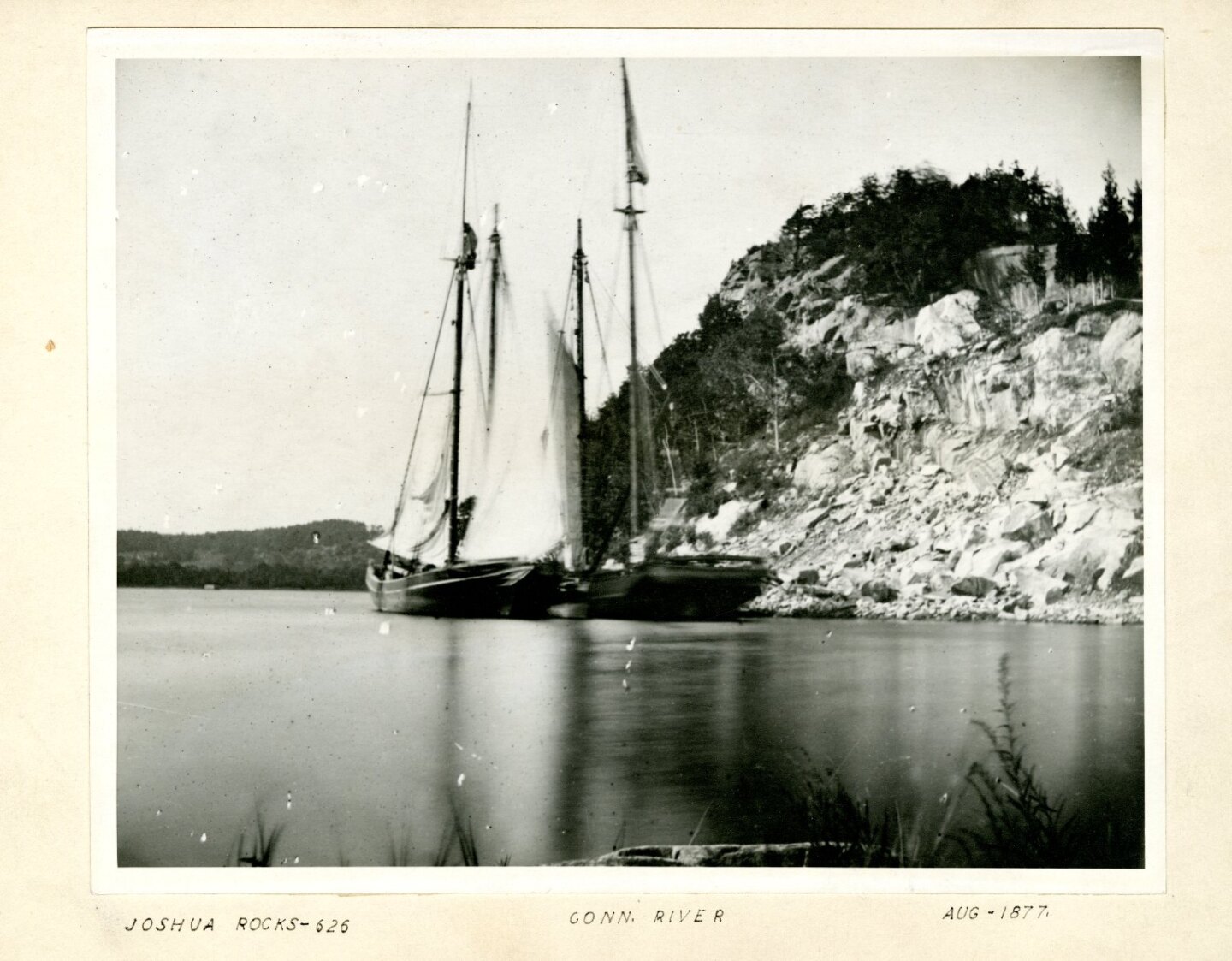 Joshua’s Rocks inspired both awe at their “grandeur” and practical plans for their use. A visitor to Lyme in 1877 writes that he could offer only a “faint idea” of the memorable sight. He describes “rocks by the acre” piled up and resting on one another, “as secure as the Rock of Ages.”[2] Others that year viewed the 60-foot high granite bluff as a commercial opportunity. A photograph by George Bradford Brainerd (1845–1887) shows two schooners tied up at the cliffs, waiting to load blocks of stone hewn from its working west face. The magazine Stone reported in 1894: “The old Joshua Rock Quarry at Essex, Conn. (sic), that has been lying idle for the past year will soon start up with a gang of quarrymen of two hundred or more.” The quarry would be “run by New York capitalists to get out paving stones for New York City.” In 1911 the Joshua Rock Granite Quarry, recently operated by C. E. Pratt of Essex, lay idle again.[3]