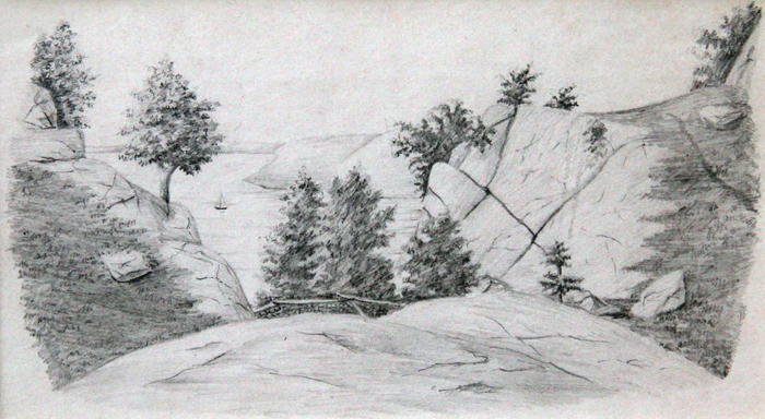 Charles DeWolf Brownell’s close-up depiction of Joshua’s legendary seat, dated August 22, 1858, captures the sweeping vista from the rock ledge while evoking the landscape’s layered history. Brownell was born in Providence but moved with his family to Hartford early in his childhood. Turning away from the practice of law and influenced by the artistic talent of his mother Lucia Emilia DeWolf Brownell (1796–1884), he published in 1853 an illustrated history of America’s native tribes. The next year, while studying landscape painting, he received an M.A. degree from Trinity College, and in 1855 he began offering lessons in painting and drawing.[5]