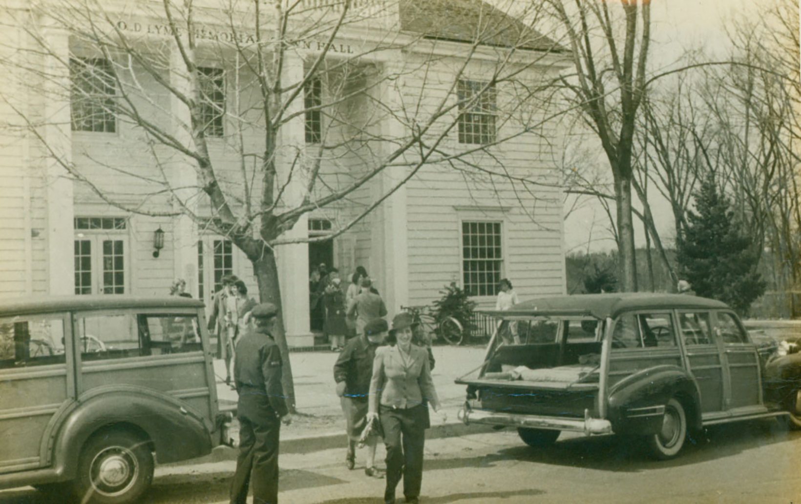 Civil defense efforts in Old Lyme during World War II included preparations for a possible enemy air raid. At the Town Hall volunteers and rescue vehicles responded to a hypothetical attack on March 29, 1942.