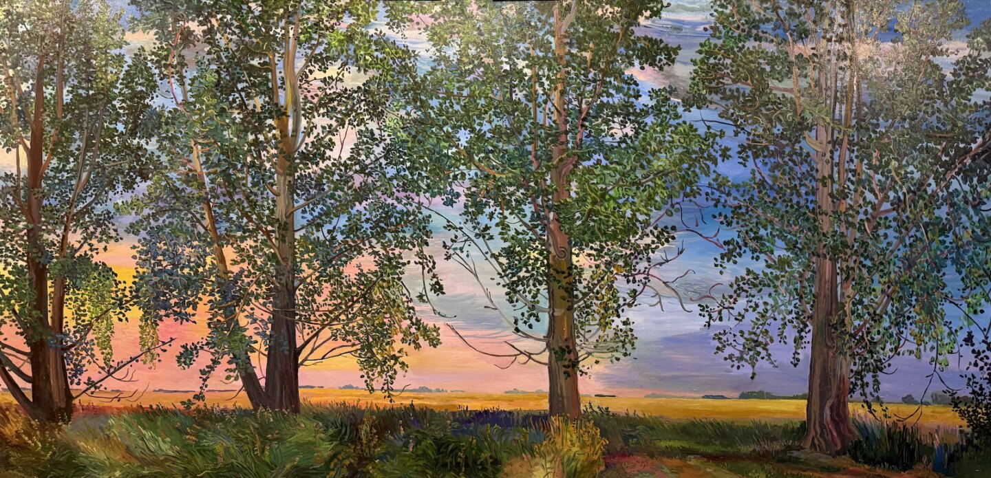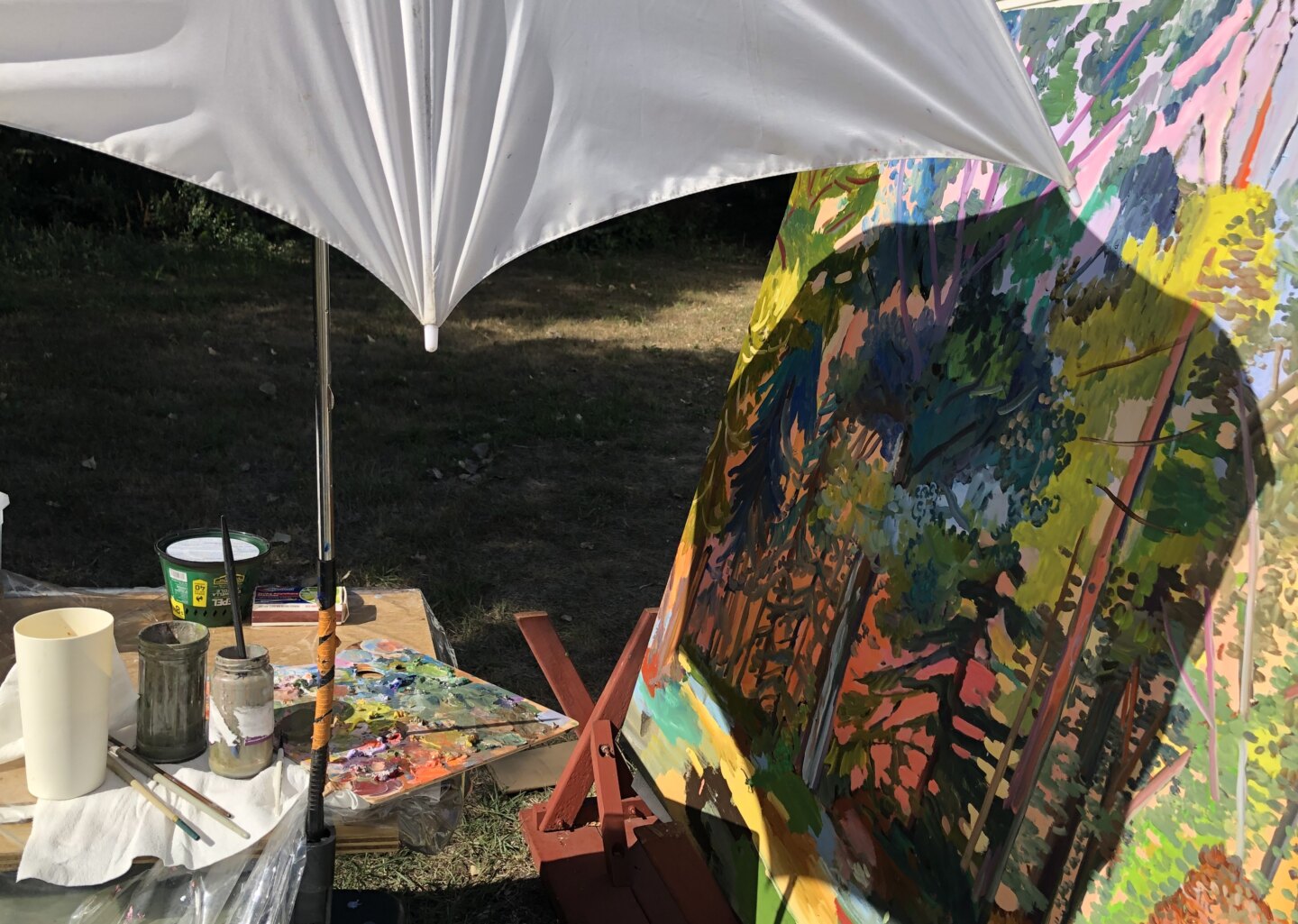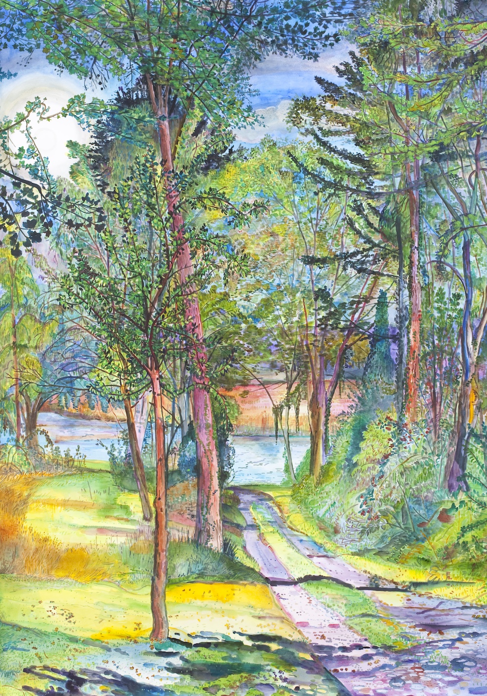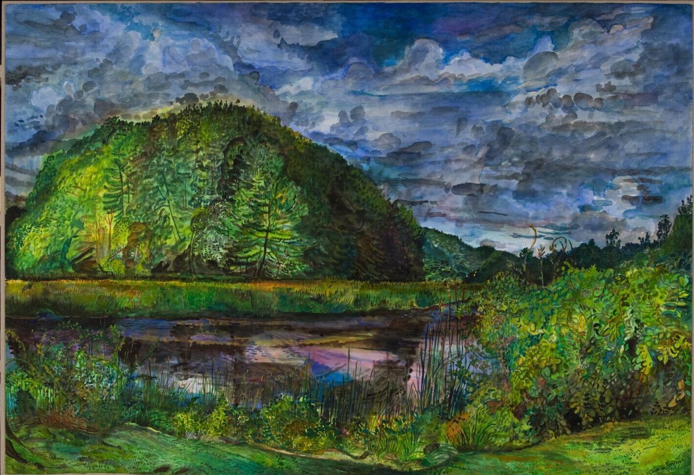 Painter, printmaker, and educator Nancy Friese (b. 1948) immerses viewers in landscapes that percolate with texture and color. Working outdoors, often on large canvases or sheets of watercolor paper, she relies on keen observation and the ability to register the vitality and evanescence of nature through abundant detail and exhilarating hues. Friese’s vivid paintings and prints burst with life, expressing not only how invigorating it is for her as a contemporary artist to make art inspired by nature, but also the vivaciousness of her muse, nature. Friese touches every area of her canvas each time she paints, sustaining as a living thing the landscape that emerges from her brush, even across numerous sittings.