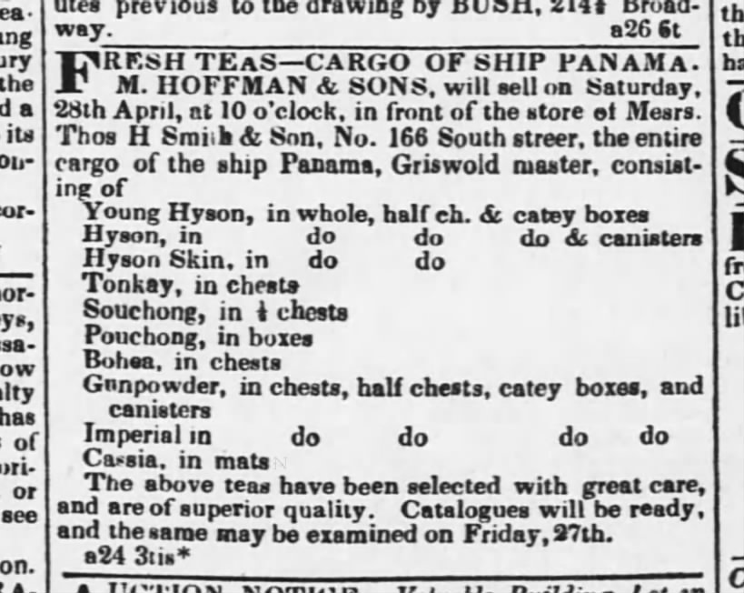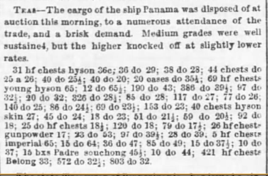 Upon arrival at the New York harbor, the contents of the N.L. & G. Griswold ships would be put up for sale. Exact business records for the Griswold firm have not been found, and an examination of U.S. Customs records did not yield specific details about their cargo. However, newspaper advertisements clearly indicate that the tea was auctioned by specialty houses. In the April 27,1832, issue of The New-York Evening Post, an advertisement states: “Fresh teas – Cargo of Ship Panama. M. Hoffman & Sons will sell on Saturday, 28th April, at 10 o’clock.” Inspection of an advertised tea shipment might be offered in advance of an auction: “Tea notice – The catalogue of teas, cargo of the ship Panama is now ready and the sample packages may be examined on Monday at the store of Thos. H. Smith & Sons, 166 South Street.”[4] Auction results were also publicized, and a notice in the Boston Morning Post in April 1841 states: “The sale of Panama’s teas today went off with great spirit. The teas were fresh and wanted of fair quality.”[5] An announcement in the New-York Evening Post in May 1849 notes: “Teas – The cargo of the ship Panama was disposed of at auction this morning, to a numerous attendance the trade and brisk demand. Medium grades were well sustained, but the higher knocked off at slightly lower rates.”[6] Whether N.L. & G. Griswold also sold tea directly from its storefront at 86 South Street in New York is not known, but an advertisement in 1838 mentions that Tuankay, a lesser grade of green tea mixed with finer grades, was available for purchase.[7]