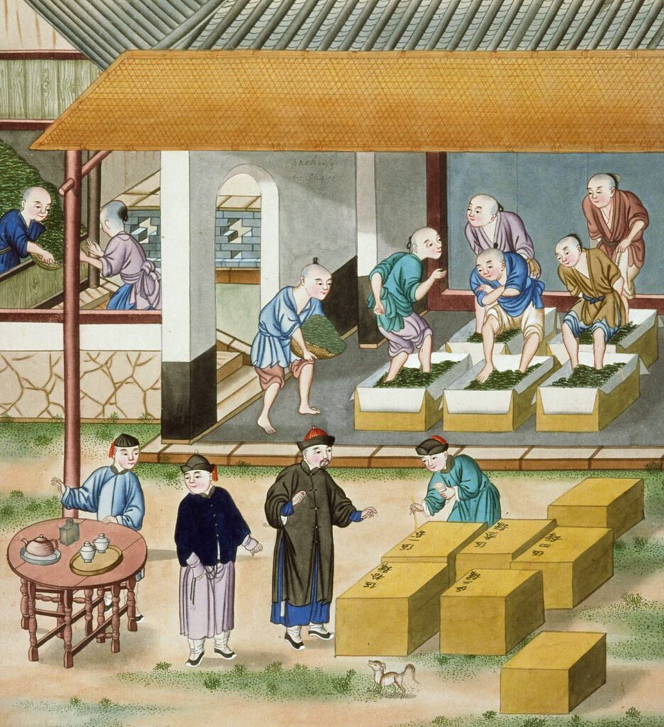 Detail of packing tea in chests, from Unidentified artist, Canton, China, Tea Production, ca. 1790. Gouache, watercolor, ink, paper, silk, 13 ½ x 12 1/8 x in. Historic Deerfield, Gift of Helen Geier Flynt, HD56.428