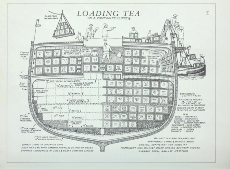 Once tea had been packed, Chinese workers loaded the chests into ships with speed and precision. It is estimated that 10,000 chests could be loaded within three days. Typically, lesser quality teas would be stowed in the vessel’s lower hold with more valuable varieties in the drier and more protected upper tiers. Bamboo matting was often laid between tiers to absorb extra moisture. Chests would be tapped close together with mallets to ensure a tight fit, and ballast or other goods, such as porcelain or textiles, would be introduced to fill any uneven nooks or crannies. [G9]