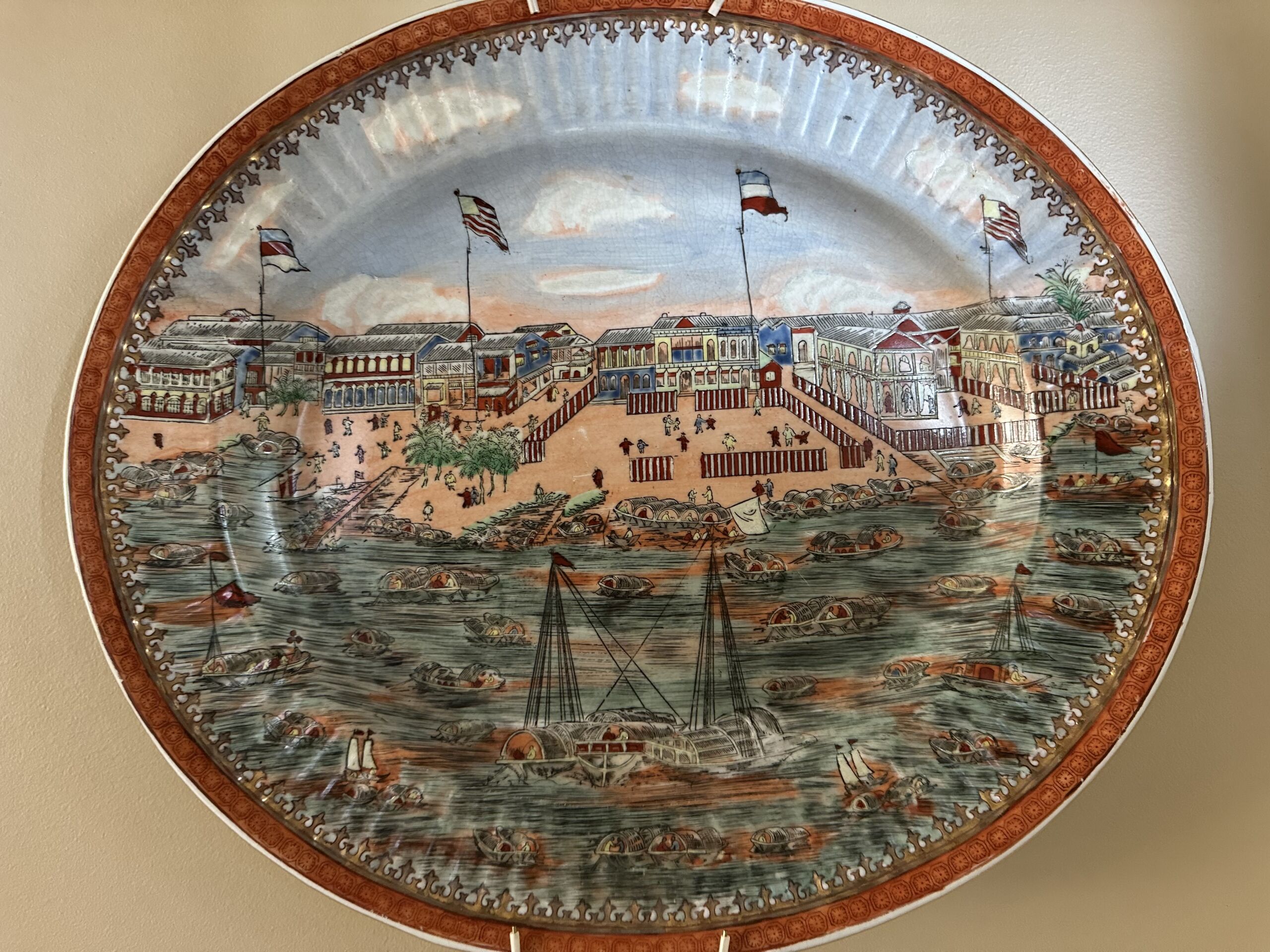 A recent commemorative plate showing the 13 factories along the Pearl River in Canton where foreign merchants conducted trade with China (United Wilson Porcelain Company, ca. 1978). Private collection.