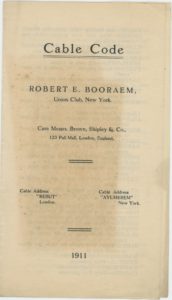 In addition to personal cable codes, commercial code books, such as the Acme Commodity and Phrase Code (1923), were published as early as the 1870’s and as late as the 1950’s. Presumably the telegraph operators were not privy to these publications. Privacy was an important benefit of cable codes, but they were also used as a cost saving measure. As one cable code word represented an entire phrase, use of cable codes, commercial or private, shortened the length of a message, which would be priced according to the number of words it contained. The personal cable code that Robert Booraem sent to Platt Hubbard reflects the prominent New Yorker’s importance in business and social circles but also gave cover to pursuits in his personal life.