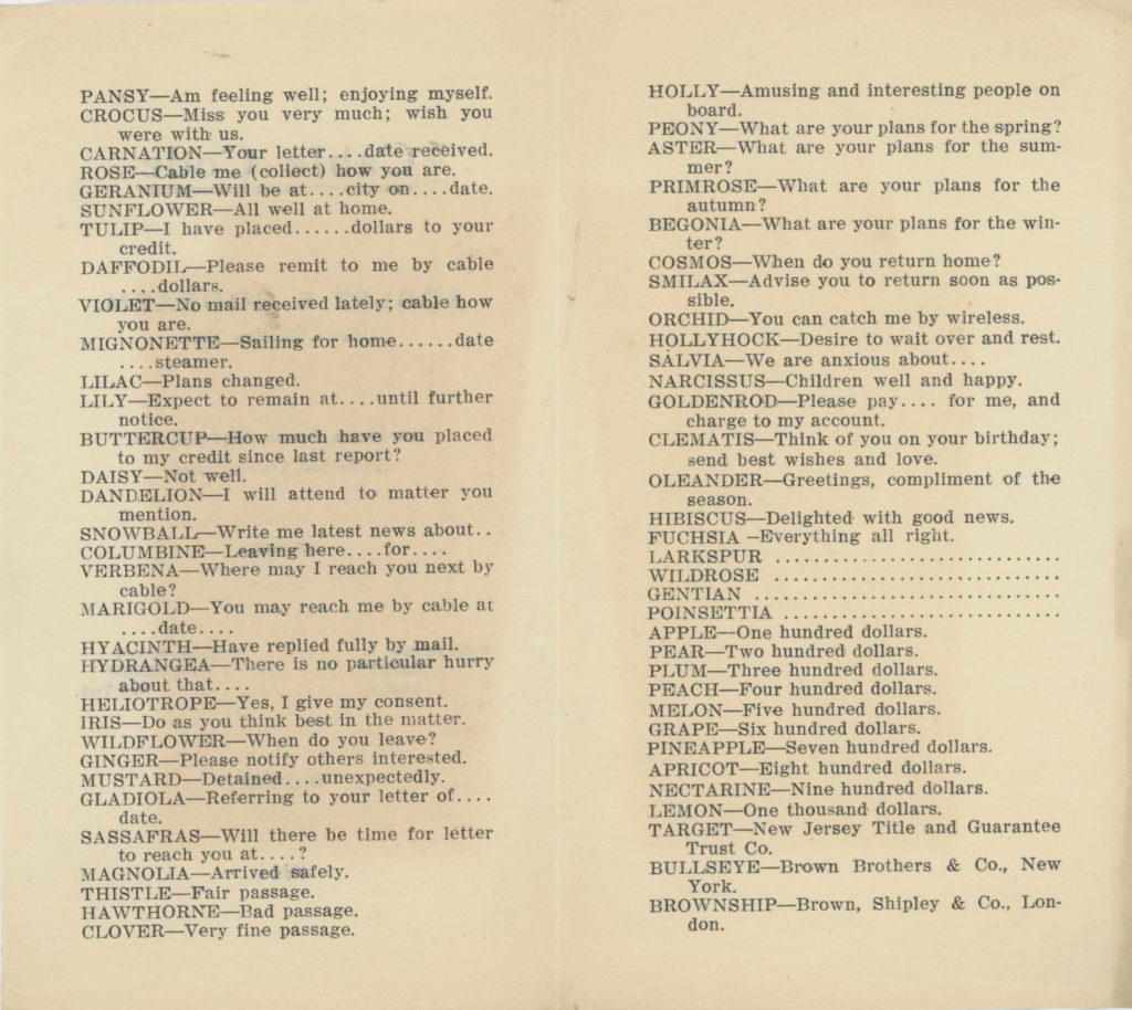 Cable codes were published directories of words that would be used in cables or telegrams and understood by the reader to represent something more than what was literally written. How else could one send private and discreet telegraph messages to one another, messages that would be read by operators on both the sending and receiving ends without using some sort of obfuscation. For example, a telegram using Booraem’s cable code might read: “MUSTARD GERANIUM PARIS RITZ SIXTEENTH,” which meant “Detained unexpectedly. Plans changed. Will be at Paris Ritz on the 16.”