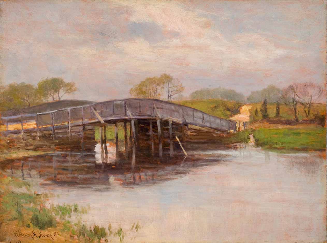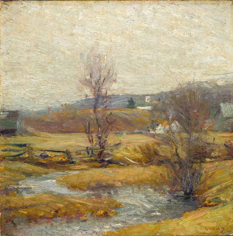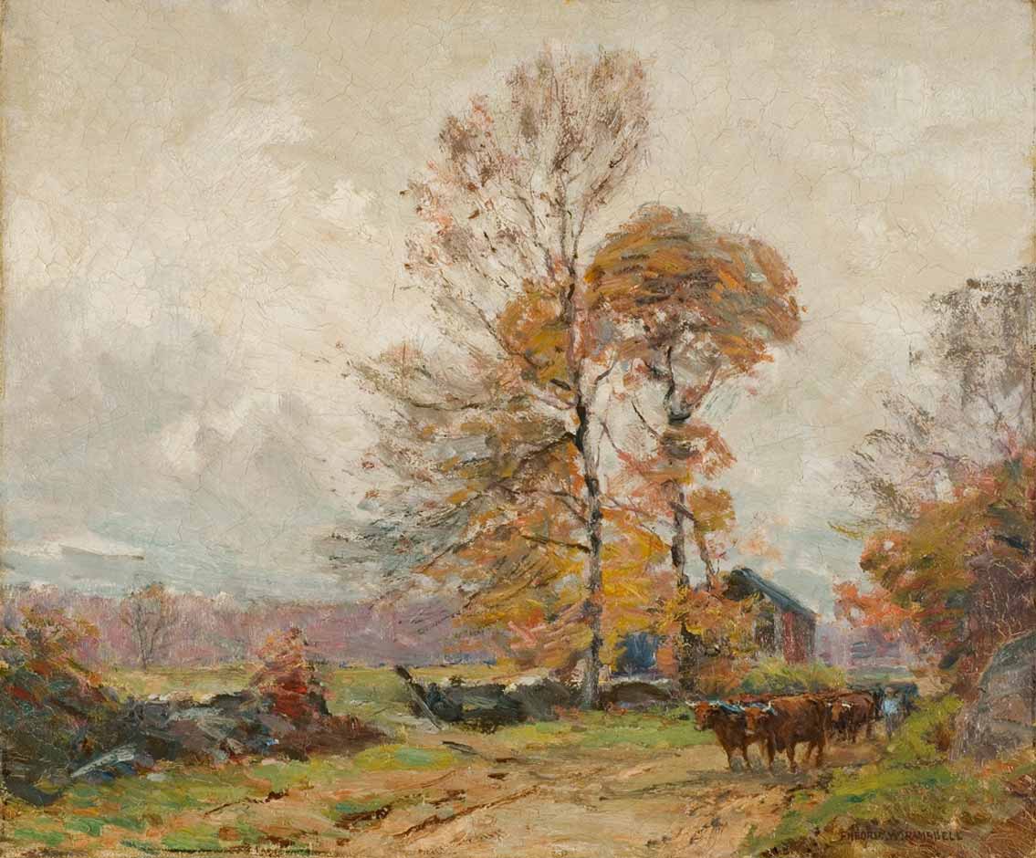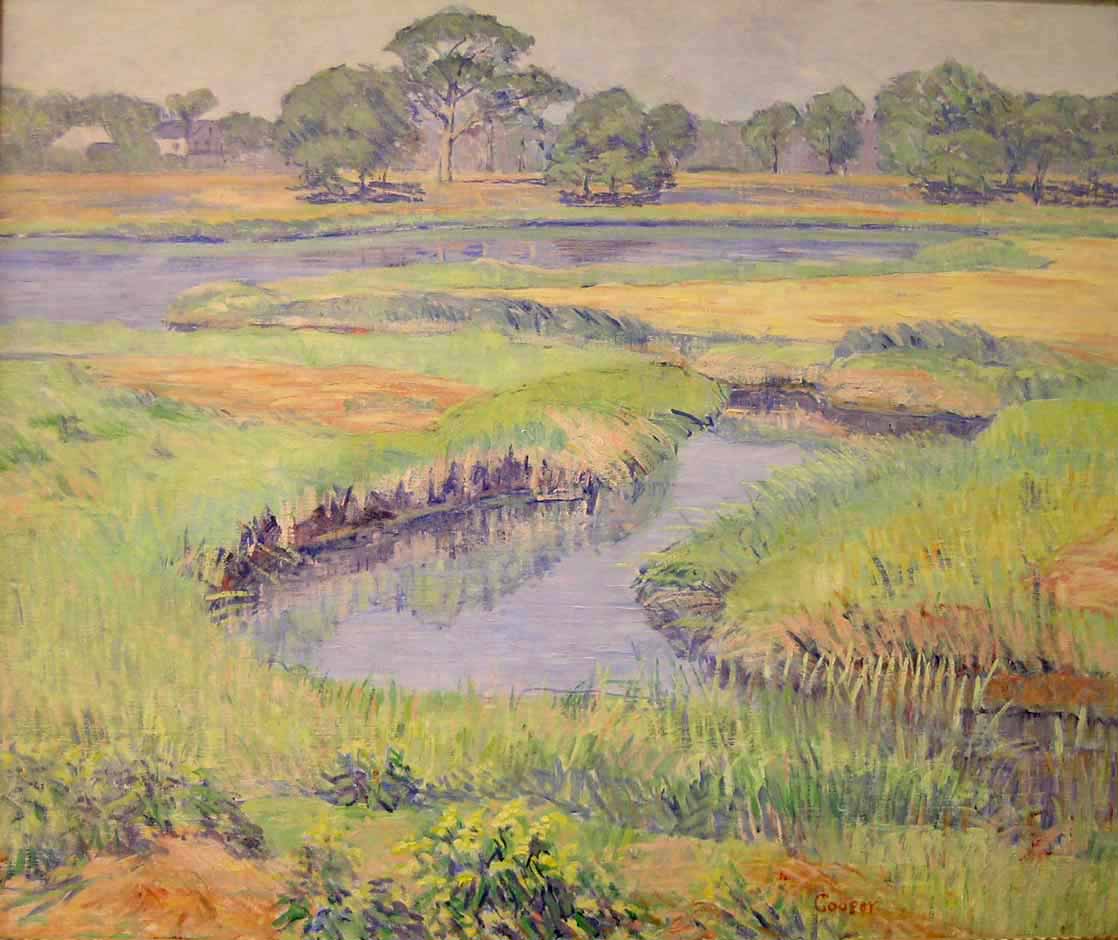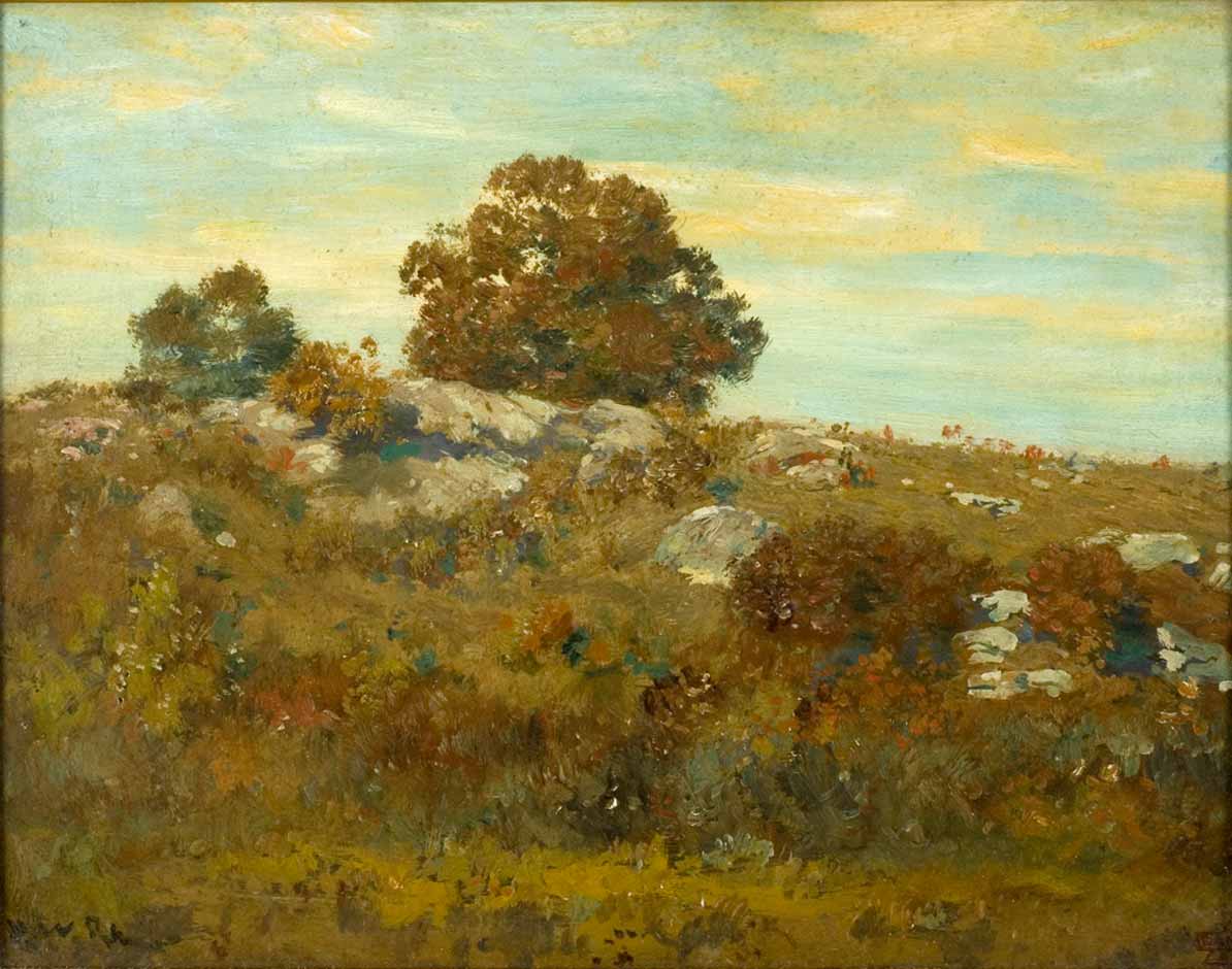 By the 1890s Old Lyme was reachable by a combination of rail and ferry. The village became a country retreat, buffered by marshes to the south and rolling farmland and forest to the north. Its one constant and defining feature was an impressively varied landscape that combined meadows, marshes, ancient trees, and winding rivers with old New England buildings, homely dirt roads, and well-worked farmlands. A landscape steeped in historical associations and nostalgia, Old Lyme was a place “only waiting to be painted,” as one of the artists boasted. Writer Percival Pollard expanded in The New York Times in 1908: “The prophecy, too, that the fields, the oxen, the rocks, and the trees in that region were, after all, limited in number, and they would soon all have been painted, has held obviously true.”