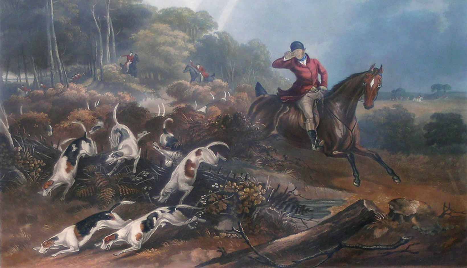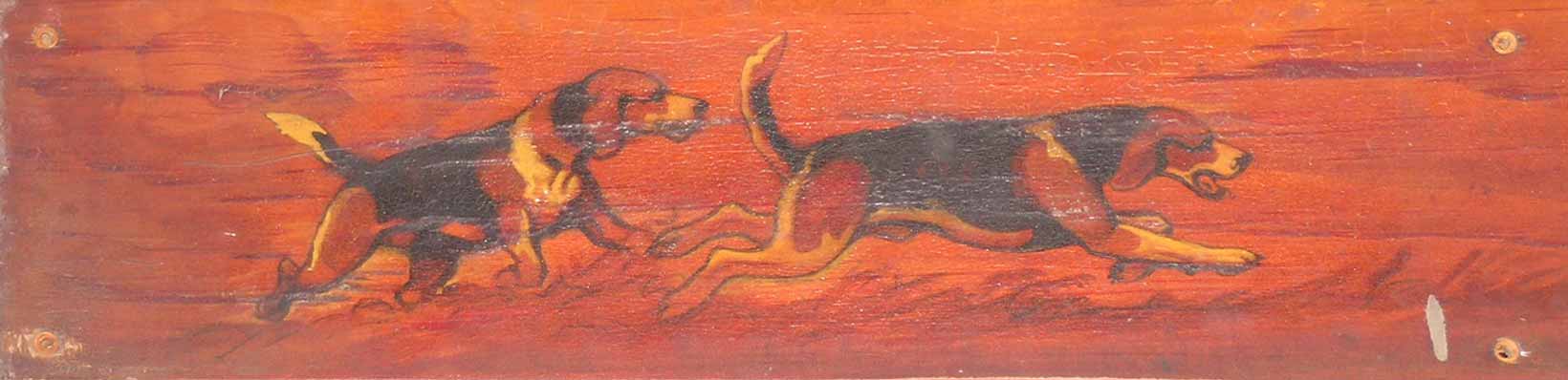 The six hound dogs in The Fox Chase are very similar to the dogs that are featured in each of the English prints by E.C. Turner that hang above the fireplace. Such a fan of the hunt was The Fox Chase artist Henry Rankin Poore that he even painted wood panels of dogs chasing a rabbit, to be attached to the outside of his car.