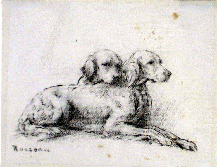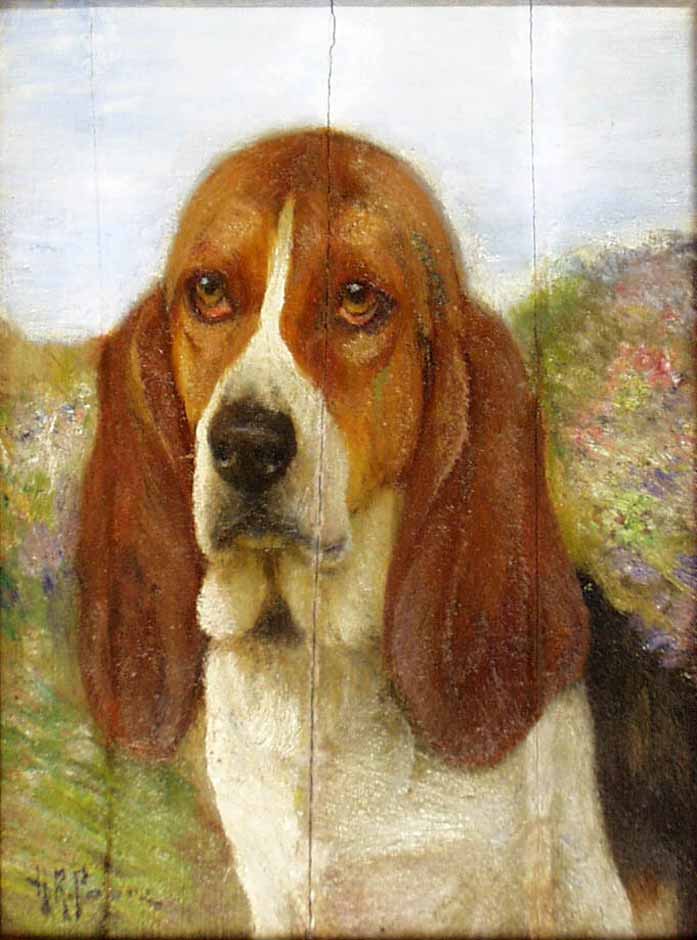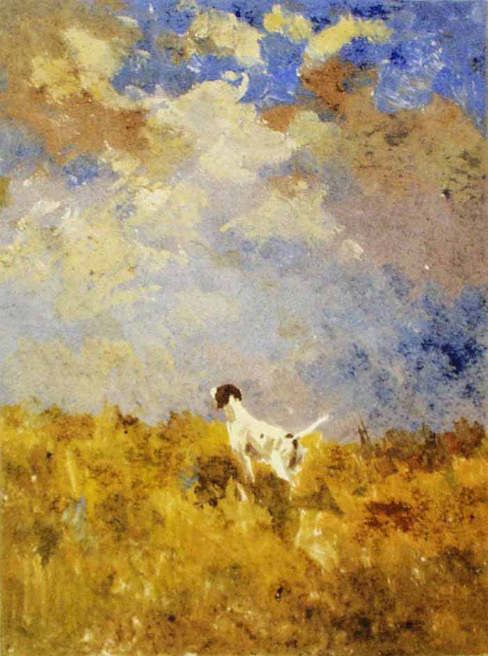 Although not featured in The Fox Chase, nor represented by a panel in the Griswold House, the artist Percival Rosseau (1859–1937) was a leading painter of dogs who lived on Grassy Hill in Lyme. His friends in the Lyme Art Colony encouraged him to buy a pre-Revolutionary-War house in the area. He became active in the Lyme Art Association and would show in the annual exhibitions in town. Rosseau had annual exhibitions in New York at prestigious galleries and devoted his work to the two most popular breeds of hunting dogs — the English setter and the pointer. Next to his studio in Lyme he kept a kennel of five or six dogs. “A man should paint what he knows best, and I know more about animals than anything else. I have run hounds from childhood and have at my fingertips the thorough knowledge necessary to picture dogs faithfully.” –Percival Rosseau
