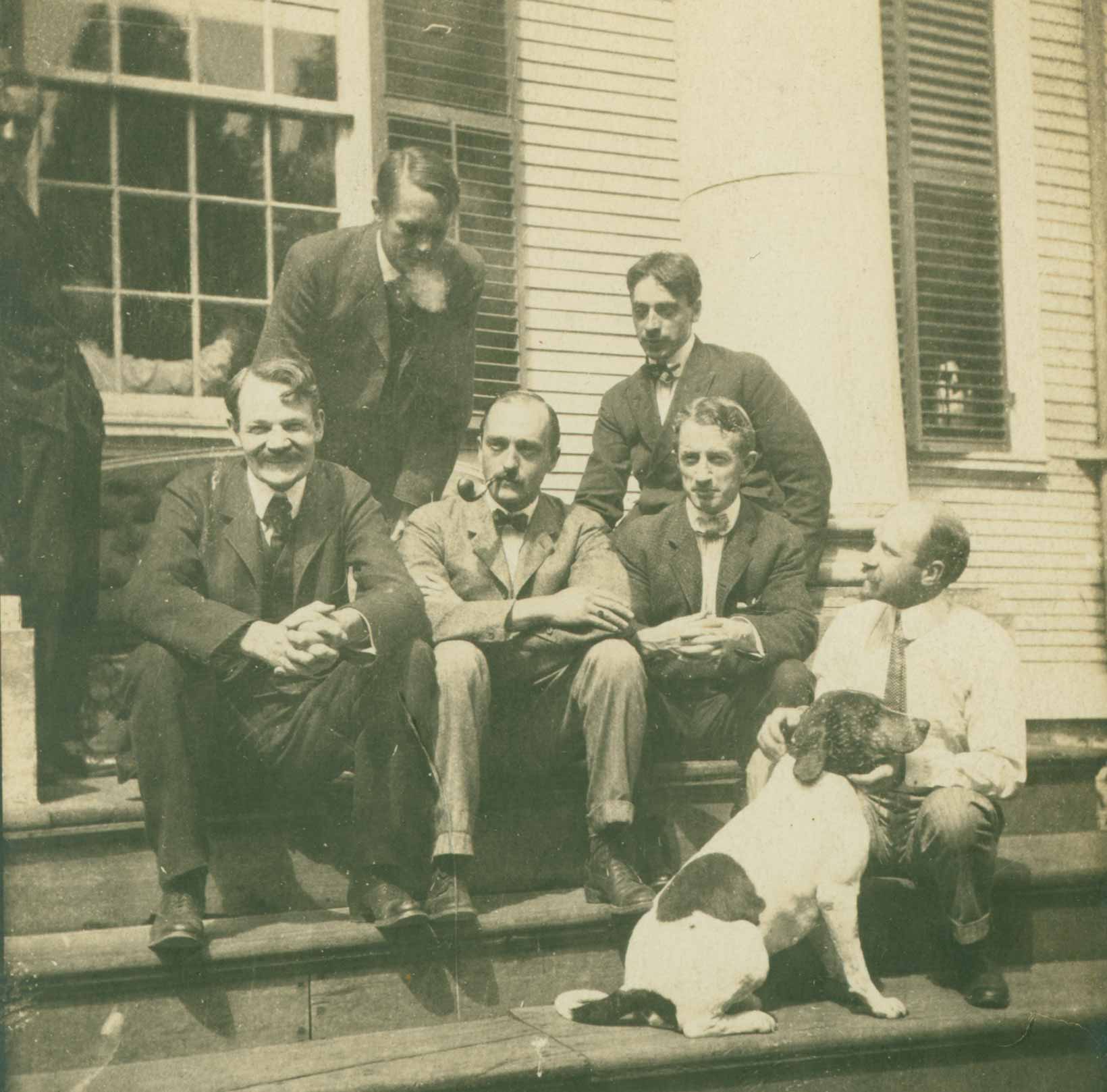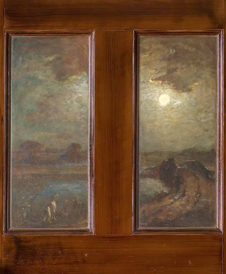 Despite Miss Florence’s fondness for cats, the artists seem to favor dogs as their companions. Several artists used their dogs as subject matter, and Poore produced several formal portrait of his dogs. Dogs also play a role in several of the painted panels and doors in the house. In 1900, Poore was challenged by art colony founder Henry Ward Ranger to paint a scene on the left panel of the door leading to the Art Colony Bedroom. It was to match Ranger’s moonlit scene of the Bow Bridge on the right panel. Poore mastered the task by painting a continuation of the scene. He extended the road to the bridge and the river and dappled them with bluish moonlight. He then placed his dog Beau at the bottom, howling at the full moon in Ranger’s panel.